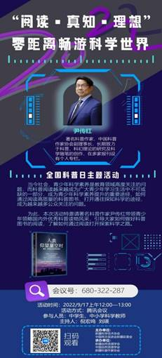 本次活動特邀請中國著名科普作家尹傳紅帶領青少年領略國內外優秀科普讀物風采,引導大家如何做好科普圖書的閱讀,了解如何通過閱讀打開探索科學之路。尹傳紅是我國著名科普作家,后著有《幻想:探索未知世界的奇妙旅程》、《漫游》、《假象》、《吃的困惑》、《櫻桃樹上的夢想》、《時間旅?》等書。
