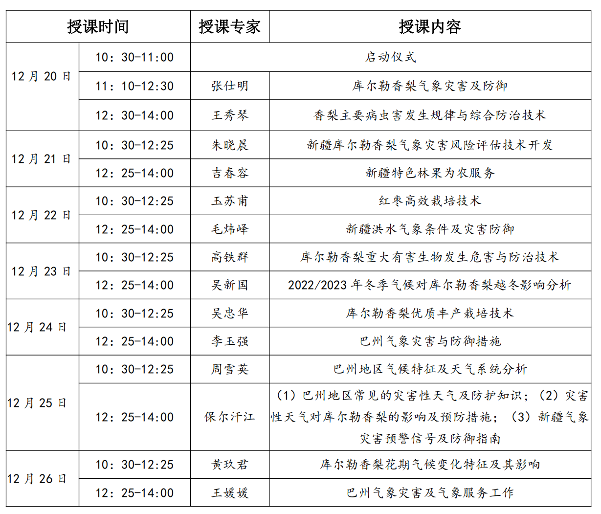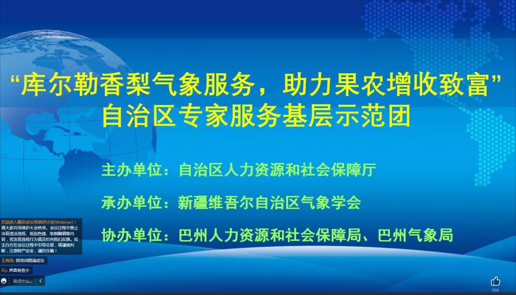 20日—26日為期一周的“專題講座”通過騰訊會(huì)議形式在線開展,由來(lái)自南京信息工程大學(xué)、新疆農(nóng)業(yè)大學(xué)、巴州農(nóng)業(yè)局、巴州農(nóng)科院、新疆生產(chǎn)建設(shè)兵團(tuán)第二師二十九團(tuán)農(nóng)業(yè)發(fā)展中心及氣象部門的14位專家、教授組成的專家團(tuán)做專題講座,針對(duì)庫(kù)爾勒災(zāi)害性天氣防御、香梨氣象服務(wù)、林果病蟲害與防治、香梨栽培技術(shù)等內(nèi)容開展技術(shù)交流、研討。參會(huì)學(xué)員主要來(lái)自巴州庫(kù)爾勒香梨主產(chǎn)區(qū)250余人。