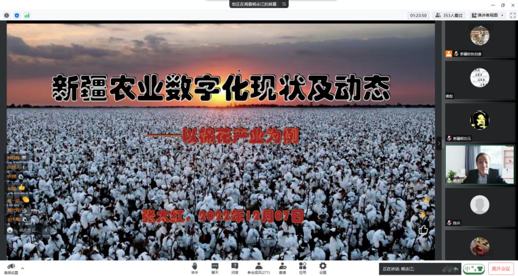 論壇還邀請了新疆農業大學教授、博士研究生導師張太紅教授做了《新疆農業數字化現狀及動態—以棉花產業例》的報告。張教授從農業文明的發端、世界棉花的簡史、世界主要產棉國家以及新疆棉花生產數字化四個方面,提出了數字化將給農業帶來全新的變化,數字是新疆棉花的未來。