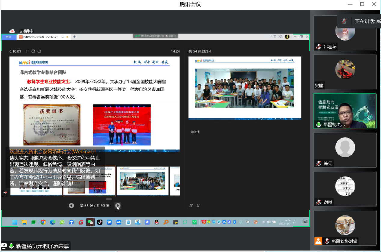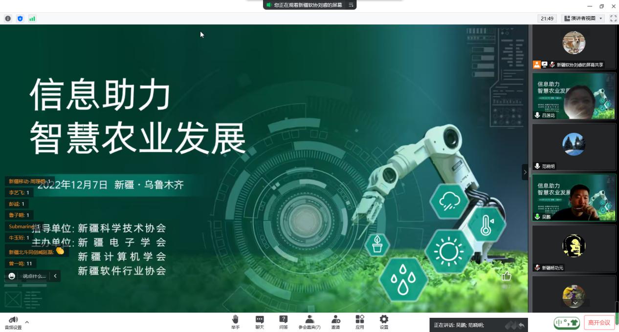 12月7日,由自治區科協指導,新疆電子學會、新疆計算機學會、新疆軟件行業協會(以下簡稱:新疆IT三會)主辦的2022年“信息助力 智慧農業”發展論壇在線上舉辦。來自各行業領導和專家、駐村工作隊工作人員、科研高校師生、行業協會以及數字農業領域的專家及相關企業代表370余人齊聚云端,共同研討交流智慧農業的研究進展,聚焦數字農業應用與創新,傳遞數字農業高新技術,分享智慧農業的應用案例和成果經驗,助力智慧農業發展。
