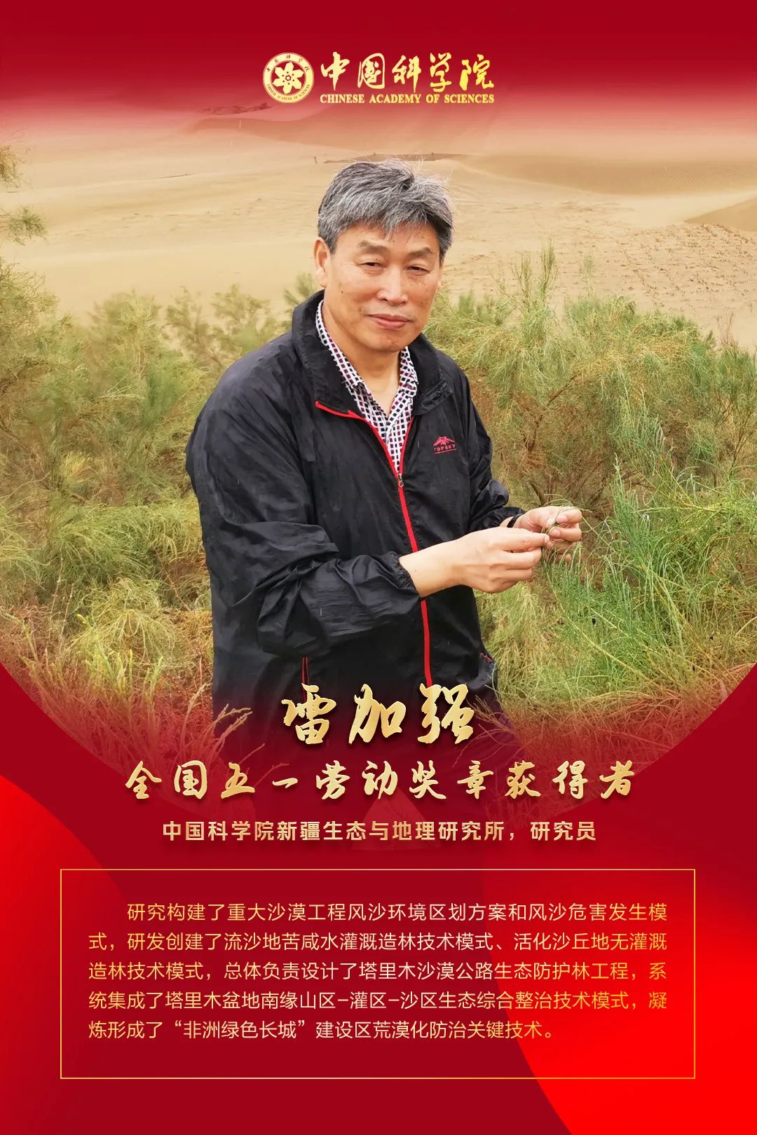 雷加強,研究員,博士生導師,長期從事風沙環境與防沙治沙研究,負責完成了國家級科研項目30余項,獲國家科技進步二等獎2項、省部級科技進步獎10項,榮獲全國防沙治沙標兵、全國先進科技工作者、新疆維吾爾自治區科技進步特等獎(個人)、中國科學院“科苑名匠”等榮譽。