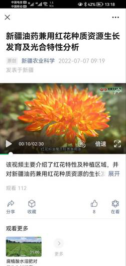 短視頻數字化出版利用原文進行內容進行數字編輯加工,通過網絡傳播數字期刊內容,方便公眾閱讀。《新疆農業科學》編輯部通過與作者和微信公眾號協作,將2022年6、7兩期刊登論文“油藥兼用紅花種質資源生長發育及光合特性分析”“腐殖酸水溶性肥對花生生長發育及產量的影響”(作者單位均為新疆農業科學院經濟作物研究所)制作成1-2分鐘短視頻,在《新疆農業科學》微信公眾號視頻欄目于2022-7-6和2022-8-18發布,受到作者讀者好評。