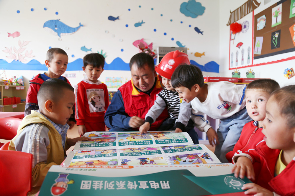 8月29日,國網阿克蘇公司的電力科技工作者在烏什鎮喀贊村幼兒園以圖文形式開展安全用電宣傳。