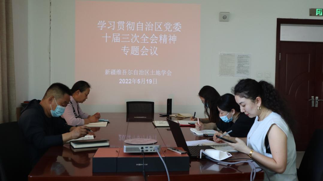 5月14日至15日,中國共產黨新疆維吾爾自治區第十屆委員會第三次全體會議在烏魯木齊召開。5月19日上午,新疆土地學會黨支部組織學習貫徹自治區黨委十屆三次全會精神,學會全體工作人員對全會精神進行了認真學習。