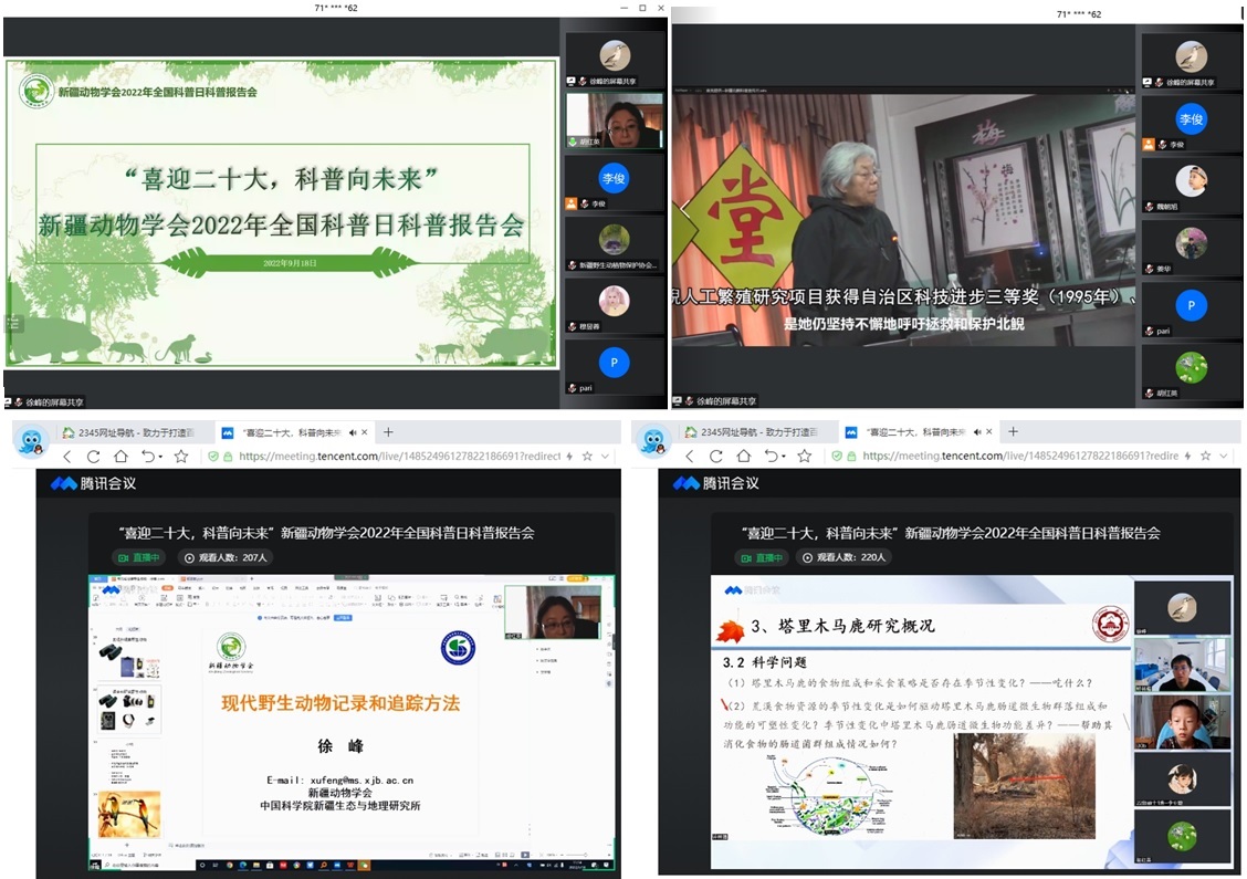 2022年9月18日,新疆動物學會通過騰訊會議及網絡直播方式舉辦了“喜迎二十大,科普向未來”新疆動物學會全國科普日活動。本次活動主要由新疆動物學會主辦,新疆大學生命科學與技術學院、新疆師范大學生命科學學院、中國科學院新疆生態與地理研究所以及新疆中學生生物競爭專業委員會協辦,來自新疆各高校及中小學的500余名師生參加了本次科普日活動。新疆動物學會秘書長胡紅英教授主持了活動開幕式。