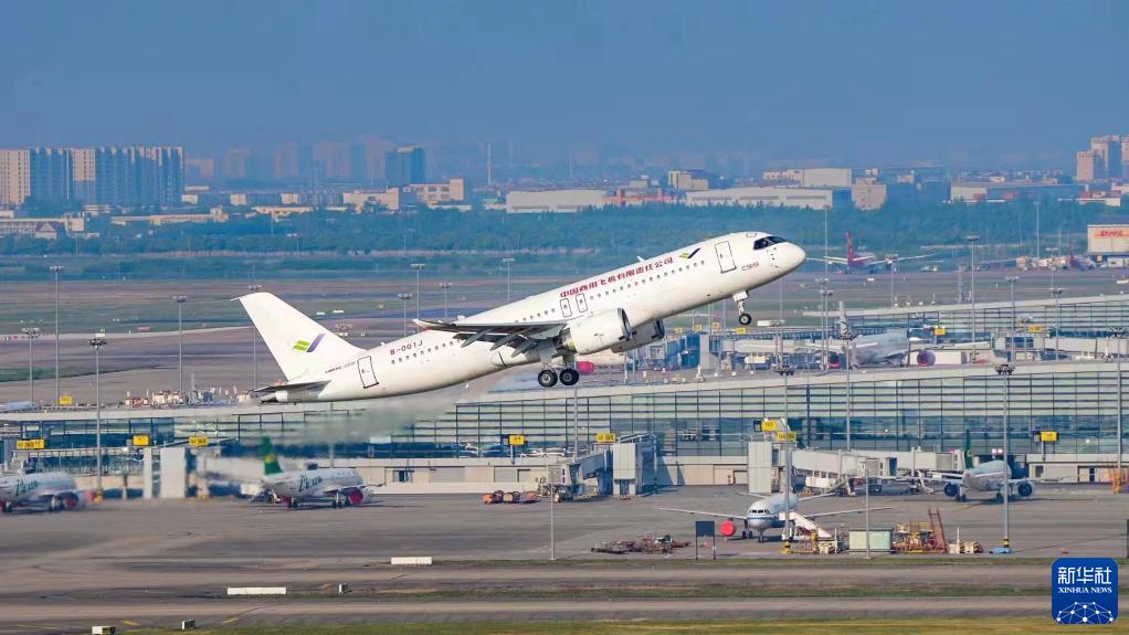 2022年5月14日6時52分,編號為B-001J的C919大飛機從上海浦東機場第4跑道起飛,于9時54分安全降落,標志著中國商飛公司即將交付首家用戶的首架C919大飛機首次飛行試驗圓滿完成。新華社發