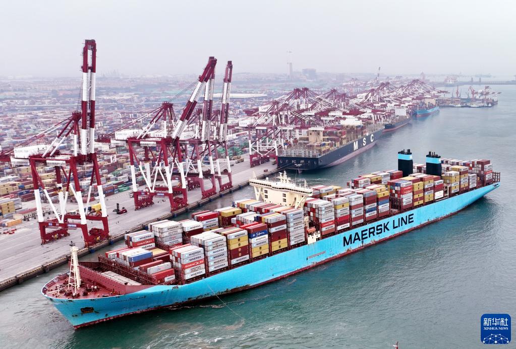 在山東港口青島港前灣碼頭,歐洲貿易航線的“美途馬士基”集裝箱貨輪解纜起航(2022年7月29日攝,無人機照片)。新華社記者 李紫恒 攝