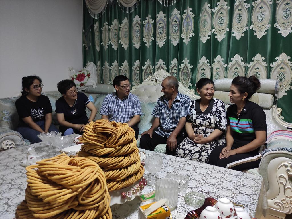 在農(nóng)戶代表麥提托合提家,各色干果擺滿了餐桌,剛炸好的馓子也端了上來,寬敞的房子里充滿了濃濃的節(jié)日氣氛。麥提托合提熱情的招呼大家品嘗馓子,高興的向大家介紹今年產(chǎn)業(yè)發(fā)展的情況,總領(lǐng)隊李永晟充分肯定了他對村里產(chǎn)業(yè)發(fā)展的貢獻,鼓勵他繼續(xù)發(fā)揮產(chǎn)業(yè)帶頭人的優(yōu)勢,帶動更多的村民走上致富的道路,把日子過得更加紅火。