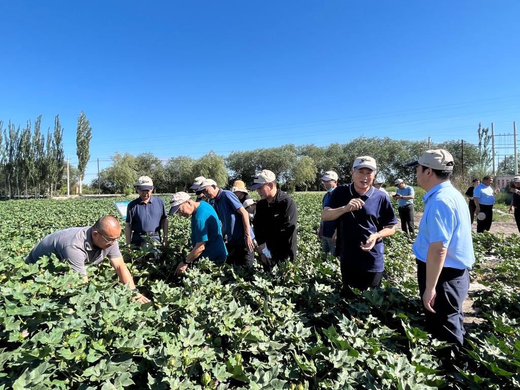 隨后,調(diào)研組一行走進(jìn)試驗(yàn)田,近距離查看棉花長勢,詢問棉田管理及施肥澆水等相關(guān)問題,并對縮節(jié)胺使用技術(shù)、肥水運(yùn)籌與生殖生長協(xié)調(diào)、長勢不同的棉田澆水時(shí)差等問題做了現(xiàn)場交流。