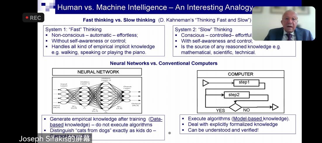 謝約瑟夫?斯發(fā)基斯是世界著名計算機科學家,國際嵌入式系統(tǒng)研究中心Verimag實驗室名譽研究主任EmeritusResearchDirector,Verimag世界級自主系統(tǒng)領域的專家,因?qū)⒛P蜋z查理論發(fā)展為被硬件和軟件業(yè)中所廣泛采納的高效驗證技術,榮獲2007年圖靈獎。他以“Machine Intelligence–Rising up to theChallenge機器智能 迎接挑戰(zhàn)”為題,給同學們講述了人工智能的相關知識。來自全國各地的5名青少年代表2022年高校科學營全體營員與謝約瑟夫教授開展對話,就關心的人工智能的發(fā)展,以及將來所面臨的挑戰(zhàn)等進行了熱烈地交流討論。