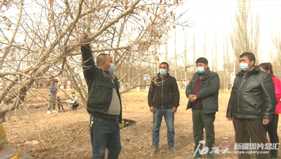 2022年3月,“科技之冬”系列培訓活動期間,林果提質增效服務團專家在伽師縣英買里鄉的農民果園,為農民答疑解惑。伽師縣委宣傳部供圖