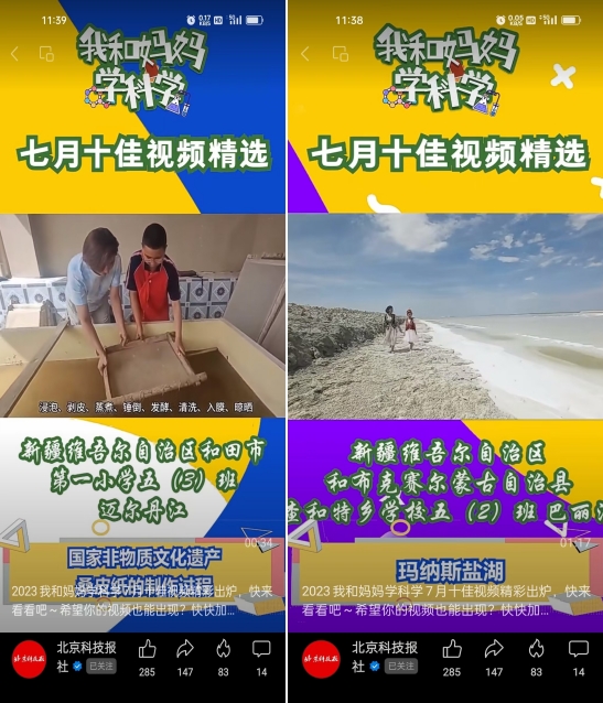 在今年“我和媽媽學科學”活動中,和田市第一小學五(3)班學生邁爾丹江與母親一起拍攝發布的科普視頻《國家非物質文化遺產桑皮紙的制作過程》、和布克賽爾蒙古自治縣查和特鄉學校五(2)班學生巴麗江與母親一起拍攝發布的科普視頻《瑪納斯鹽湖》入選7月全國十佳視頻。自治區科協《依托各類科普陣地,帶動群眾科學素質提升》、中國科學院吐魯番沙漠植物園《探尋荒漠植物生存智慧,弘揚科學家精神》及塔城地區烏蘇市第四中學《結合地方特色,以“網”傳播科學》三個案例入選全國2023年“智愛媽媽”親子教育科普典型案例。