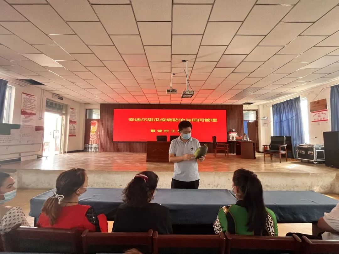 經歷過這件事后,盛凱梳理歷年來甜瓜出現的各種病害,編制《安迪爾甜瓜疫病防治和田間管理指導手冊》。同時,積極邀請自治區農科院、新疆農業大學等院校專家到村針對土質測量、整地定植、培育壯苗、植株管理、成熟度鑒別、病蟲害防治以及采收上市等關鍵技術問題開展系統性研究,引進“瑪德琳”“西州蜜25號”等甜瓜品種,采取“線上+線下”的方式,定期開展“安迪爾甜瓜提質增效課堂”,為村民補齊短板弱項,解決了甜瓜品種老化、病蟲害、種植面積萎縮的狀況,多措并舉,繁榮村“安迪爾”甜瓜種植面積擴大到2500畝,產量也有了較大提高。