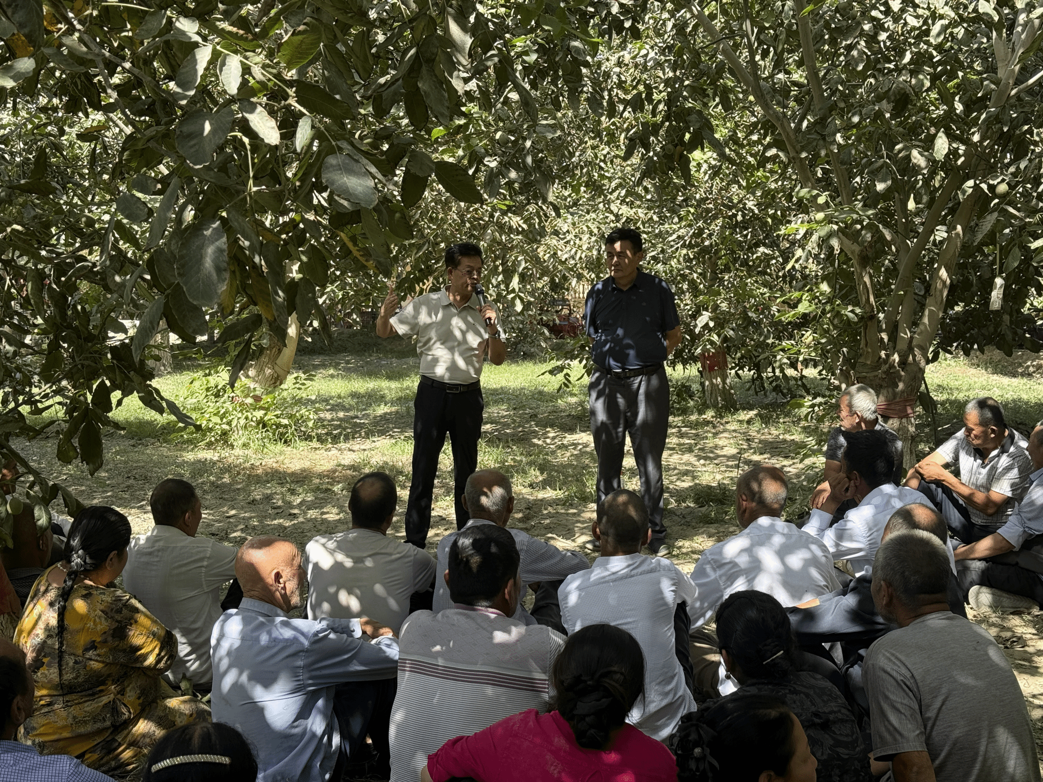 在瓊庫爾艾日克村的核桃地里,新疆農(nóng)科院果蔬研究所艾爾買克·才卡斯木研究員,向農(nóng)民講授核桃和紅棗栽培關(guān)鍵技術(shù),他聲情并茂地示范核桃夏季的修剪技法。“核桃結(jié)果期修剪要注意以‘去強(qiáng)留弱枝條’法為主,核桃樹側(cè)枝條背上直立長出來的徒長枝條要除掉、主干上延長直立長得強(qiáng)長枝條要除掉或者回縮等技術(shù),注意打開光路,這樣才能結(jié)出優(yōu)質(zhì)果。”“大家記住,紅棗現(xiàn)在要重點(diǎn)防治裂果,紅棗主要裂果(70%-80%)原因是與灌溉水有關(guān),南疆8月初開始紅棗果園應(yīng)該注意控制水,葉面噴施氨基酸鈣等肥料追肥!”在場的果農(nóng)們紛紛掏出手機(jī)錄制視頻,生怕漏掉任何一個(gè)細(xì)節(jié)。種植大戶依明尼亞孜·托合提尼亞孜感慨道:“專家就是專家!我這十幾年白種了,原來修剪還有這么多講究!”