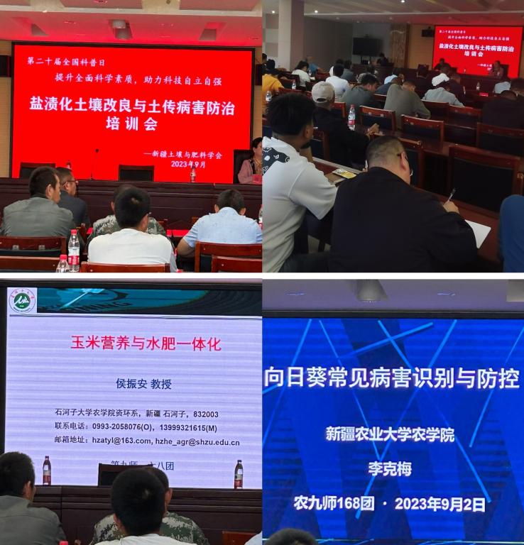 此次活動中,中國科學院新疆生態與地理研究所研究員、新疆土壤與肥料學會理事長田長彥親臨現場指導鹽堿地與作物抗逆高產栽培。石河子大學農學院教授、新疆土壤與肥料學會副理事長侯振安,新疆農業大學、中國植物病理學會理事李克梅教授分別做了《玉米營養與水肥一體化》和《向日葵常見病害識別與防控》的科學講座,對一六八團連隊主要領導和種植大戶進行了培訓。