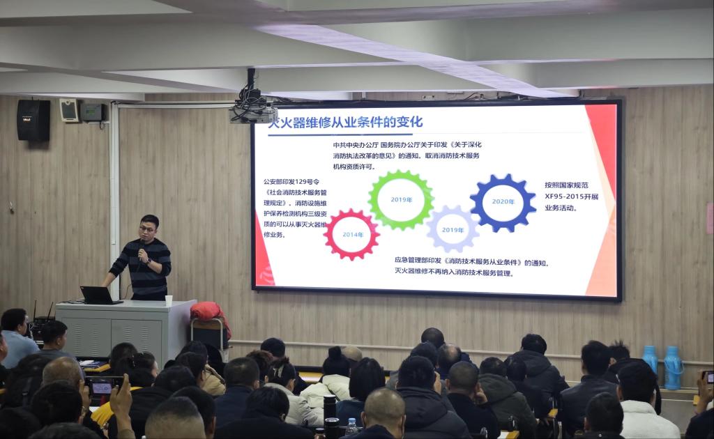 為進一步提高我區滅火器維修人員業務素質和業務能力,推進“科技之冬”防災減災救災科普宣傳活動,增強滅火器維修機構從業人員的法律法規意識,規范滅火器維修行業市場行為,2024年1月9日-12日,新疆消防協會舉辦了第二期滅火器維修企業從業人員業務能力提升培訓班。新疆消防協會黨支部書記、秘書長閆懷宣分別在開班、結業儀式上做了動員講話和講評,秘書處綜合辦主任毛玉鳳宣讀了培訓班課程安排及注意事項,來自全區滅火器維修企業258名從業人員參加了第二期培訓班。