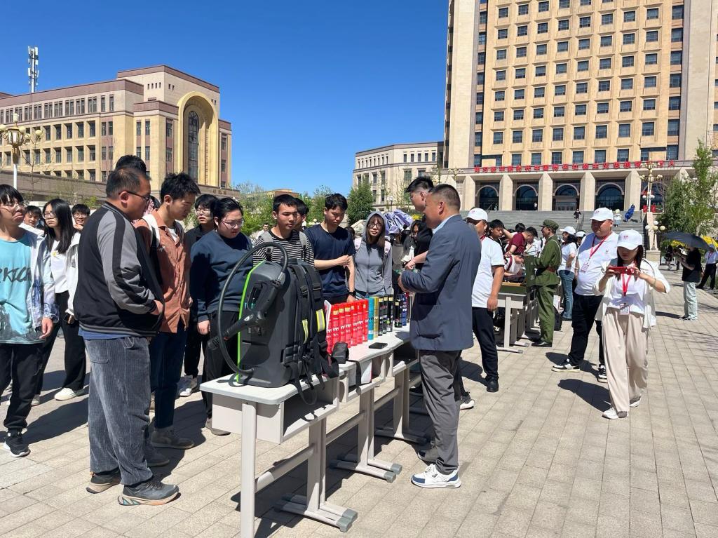 在室外活動(dòng)現(xiàn)場(chǎng),新疆消防協(xié)會(huì)、藍(lán)天救援隊(duì)、新疆人防協(xié)會(huì)、新疆氣象學(xué)會(huì)、北京衛(wèi)民安消防教育咨詢中心新疆工作站、新疆火韻精雕文化傳媒有限公司、浙江睦田消防科技開(kāi)發(fā)有限公司新疆辦事處等參加單位通過(guò)發(fā)放宣傳資料、布置宣傳展板、現(xiàn)場(chǎng)演示和解答咨詢等形式向師生講解傳授了高效的緊急避險(xiǎn)和應(yīng)急處置能力,并就救援裝備如何正確使用進(jìn)行專業(yè)講解,現(xiàn)場(chǎng)氣氛熱烈。