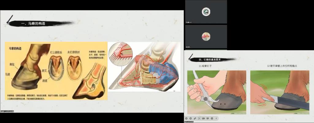 12月8日——馬匹修蹄護(hù)蹄技術(shù),由浙江九龍山莊園賽馬馬球俱樂部蘇榮老師授課,從馬蹄的構(gòu)造、釘蹄工具的種類、馬蹄的觀察技巧、釘蹄的基本技術(shù)、護(hù)理產(chǎn)品及護(hù)理方法五個內(nèi)容詳細(xì)講解了馬蹄修理與養(yǎng)護(hù)相關(guān)知識。