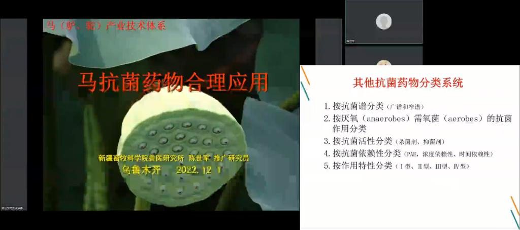 12月1日——馬抗菌藥物合理應(yīng)用,由新疆畜牧科學(xué)院獸醫(yī)研究所陳世軍老師授課,主要講述抗感染療法的基本思路、抗菌藥物的分類、抗菌藥物的作用機(jī)理以及抗感染療法的實際應(yīng)用和注意事項。