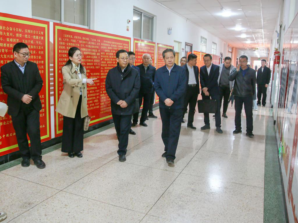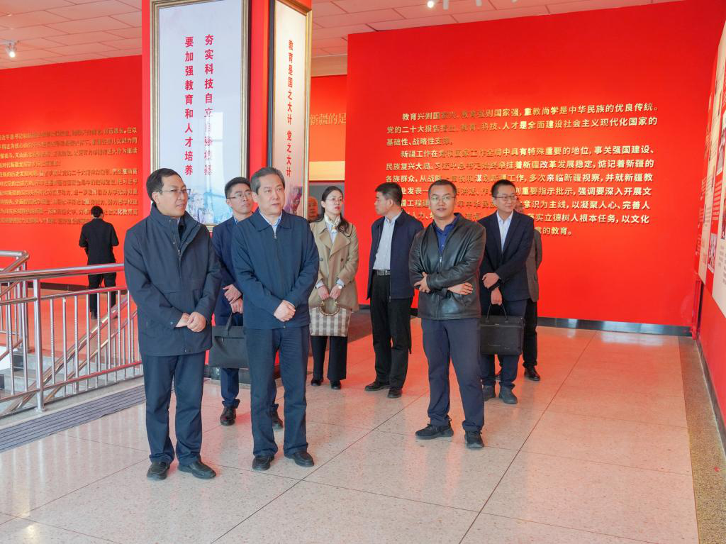 劉朋建一行重點考察了國家語言文字推廣基地(昌吉學院)、昌吉學院鑄牢中華民族共同體意識教育研學基地、圖書館朗讀設備、昌吉學院普通話水平測試站,參觀了習近平總書記在新疆的足跡展、中國共產黨精神譜系長廊、馬克思主義學院實訓室、航空服務教育中心、航空器維修訓練中心、準東研究院等。