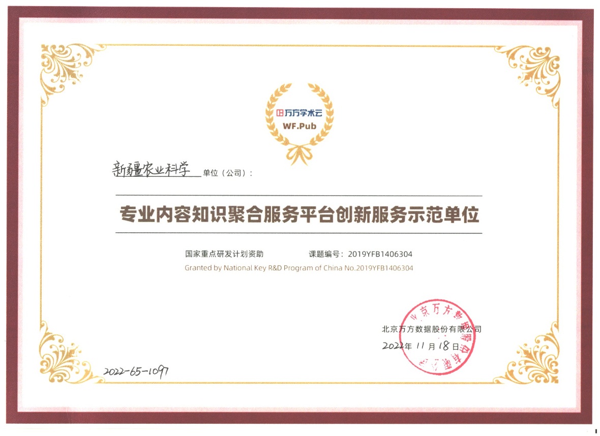 近日,《新疆農(nóng)業(yè)科學(xué)》榮獲北京萬方數(shù)據(jù)股份有限公司頒發(fā)“專業(yè)內(nèi)容知識聚合服務(wù)平臺創(chuàng)新服務(wù)示范單位”稱號。