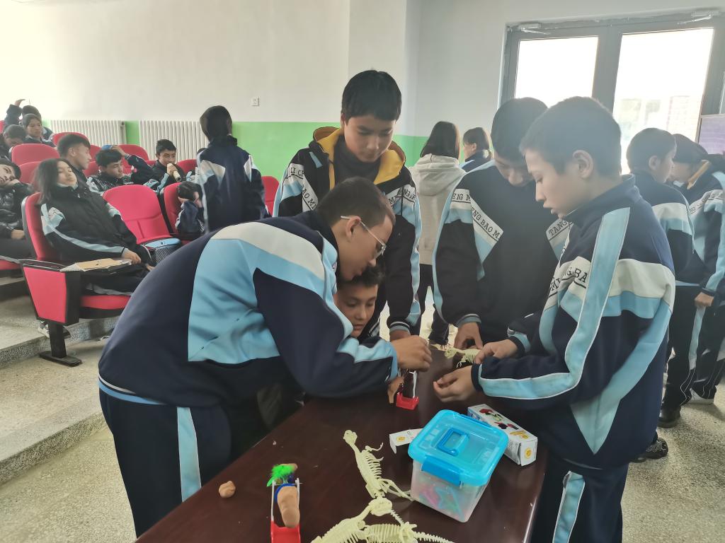 中國科學(xué)院新疆生態(tài)與地理研究新疆自然博物館副館長、新疆科學(xué)探險(xiǎn)協(xié)會(huì)理事長王虎紋與新疆自然博物館科普工作人員于源博做《漫游恐龍的故鄉(xiāng)》、《遠(yuǎn)古的寶藏-化石》等系列科普課程,圍繞“侏羅紀(jì)時(shí)代的恐龍”開展實(shí)踐,帶領(lǐng)學(xué)生重返恐龍時(shí)代,跟隨“古生物科學(xué)家”的腳步,重新從化石中發(fā)現(xiàn)、研究、復(fù)原恐龍,深入探索新疆恐龍的“前世今生”。科學(xué)課題上,同學(xué)們興致勃勃,不僅聽到了一場有趣而生動(dòng)的科學(xué)課程演示,也通過團(tuán)隊(duì)協(xié)作動(dòng)手實(shí)踐了恐龍骨骼搭建、體會(huì)行走動(dòng)力平衡的原理,通過模擬古生物學(xué)家的工作過程,更深入地了解恐龍及其時(shí)代的特點(diǎn),同時(shí)也提高了他們的科學(xué)素養(yǎng)和學(xué)習(xí)古生物學(xué)的探究方法。