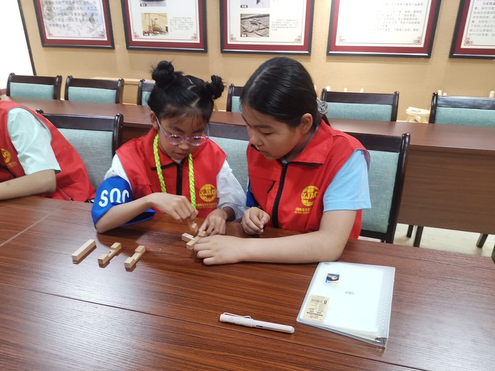 隨后,大家來到“魯班文化廳”開展質量創新與實踐科普活動,質量老師向同學們講解了質量管理的核心內容,培養大家從小養成質量管理PDCA(計劃-執行-檢查-處置)的思維方式,引導同學們做任何事情都要“想好了再做,一次把事情做對”,并邀請優秀學員代表分享往期活動成果。博物館專業老師傳承魯班文化,弘揚工匠精神,講解魯班鎖的歷史、淵源和解鎖技巧。同學們四人一組動手拼裝魯班鎖,實踐過程中遇到問題,小組成員互相探討,互相幫助,培養了學生的空間想象能力、邏輯思維能力及團隊合作能力。