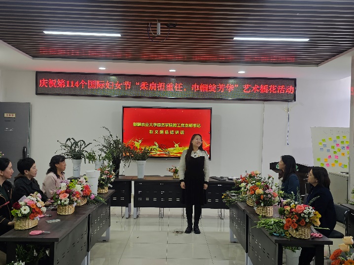 英姿颯爽競風流,巾幗建功正當時。3月8日上午,為了豐富女科技工作者的精神文化生活,加強黨支部建設,營造溫馨和諧、健康向上的節日氛圍,新疆園藝學會聯合新疆農業大學園藝學院教工黨支部、自治區科協第四黨支部、新疆女科技工作者協會黨支部共同舉辦“柔肩擔重任,巾幗綻芳華”藝術插花主題黨日活動。四個支部共計40余名女同胞代表歡聚一堂,共同慶祝第114個“三八”國際勞動婦女節。