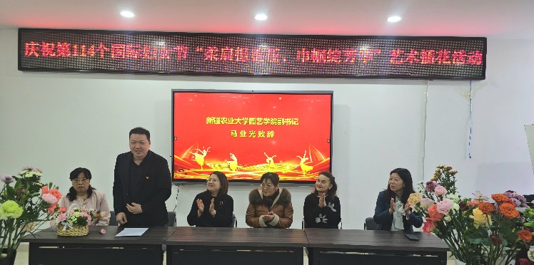 活動中,園藝學院黨委副書記馬業光同志向參加活動的女科技工作者、女教職員工致以最美好的祝福和誠摯的問候!他表示,過去一年,在自治區黨委、政府的領導下,全區女科技工作者們緊緊圍繞“八大產業集群”建設精準發力,在各自崗位上展示了新時代新女性奮發有為、拼搏進取的靚麗風采。在節日到來之際,他代表園藝學院黨委向在座的全體女同志們致以崇高的敬意和衷心的感謝!希望廣大女同志們牢記囑托,勇擔使命,以良好的職業道德、崇高的奉獻精神,同心同德、團結協作,圍繞自治區高質量發展工作大局,奮力拼搏。努力做時尚的引領者,風尚的推動者,譜寫新時代絢麗的巾幗華章。