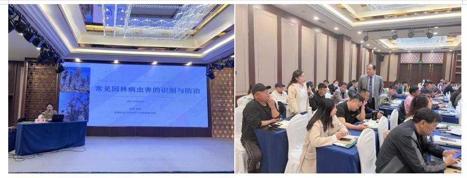 新疆農業大學林學與風景園林學院阿地力?沙塔爾教授結合30多年從事病蟲害防治經驗,從園林植物病蟲害的特點、我區園林植物有害生物發生趨勢、影響主要園林病蟲害種類演替的原因及防治對策等四個方面對學員進行了培訓和學員互動交流。