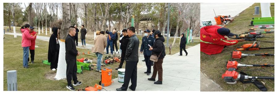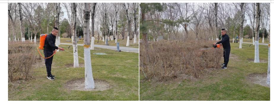 在克拉瑪依市世紀公園,吳其良工程師運用修剪機械,結合學員在工作中植物修剪遇到的問題,現場對學員進行了實操培訓。李德鵬工程師對新動能園林機械的使用及樹木涂白噴涂機進行了實操講解。