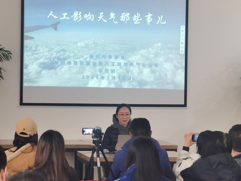 自治區人影辦副主任、高級工程師李圓圓向氣象局各直屬單位職工、社區居民講解人工影響天氣的原理,包括人工增雪、人工防雹的相關知識,并與到場的各族居民積極互動,用通俗易懂的語言和生動的例子向大家科普氣象知識,增強居民防災減災意識,保障人民生產生活安全。