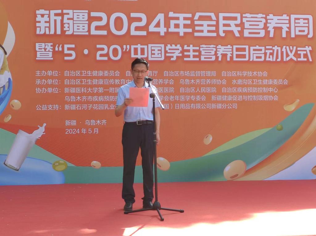 新疆醫(yī)學會副會長、自治區(qū)衛(wèi)生健康行業(yè)新興組織黨委書記鄒小廣,自治區(qū)科協黨組成員、副主席擺曉宏,自治區(qū)市場監(jiān)督管理局二級巡視員彭繼東,自治區(qū)教育廳體衛(wèi)藝工作處四級調研員王倩分別在啟動儀式上致辭。新疆營養(yǎng)學會理事長李莉同志針對2024年全民營養(yǎng)周和5·20中國學生營養(yǎng)日傳播主題核心信息進行解讀。