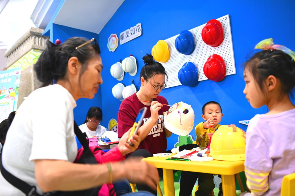 游客在廢舊安全帽上進行“帽”美如花涂鴉創作