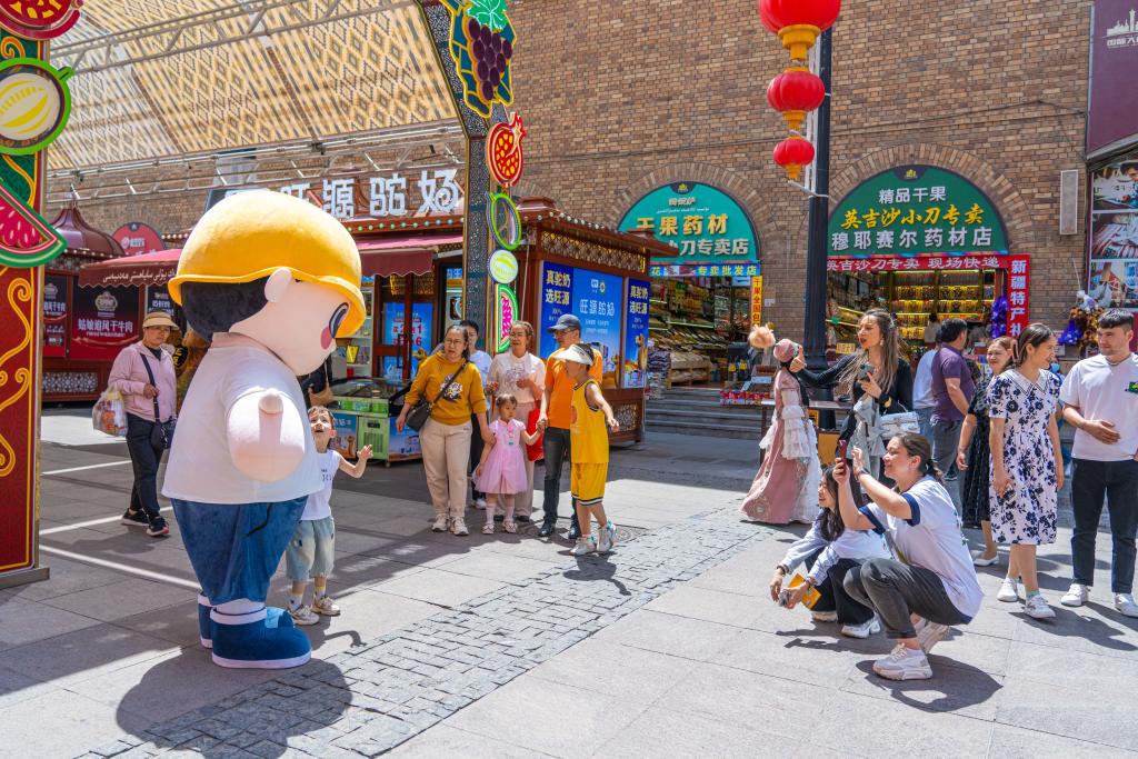 5月25日,在烏魯木齊國際大巴扎步行街,往來游客圍觀“電網體驗師”人偶
