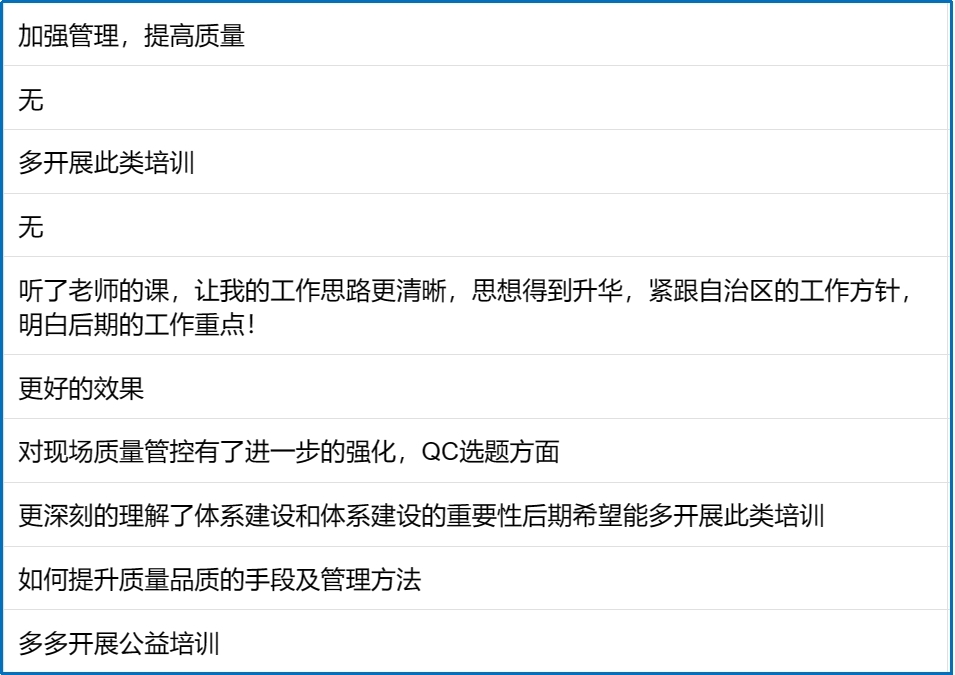 我區(qū)部分企業(yè)現(xiàn)場管理負責(zé)人、質(zhì)量管理人員代表共計250余人參加培訓(xùn)。為企業(yè)掌握現(xiàn)場管理方法、培養(yǎng)各類管理人才,提升企業(yè)創(chuàng)新、創(chuàng)造、改進能力奠定基礎(chǔ)。