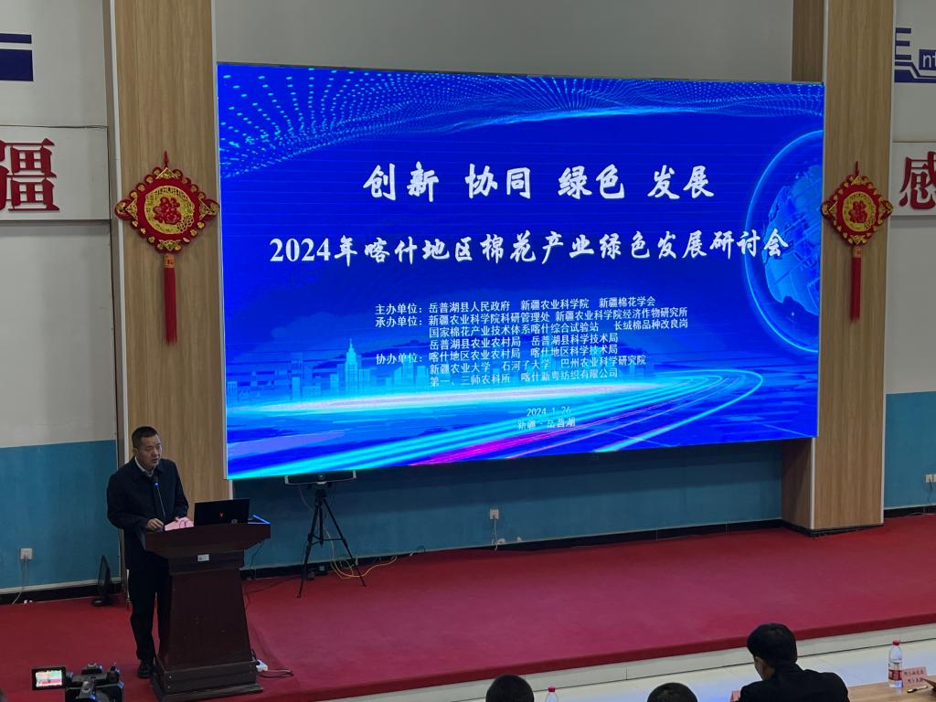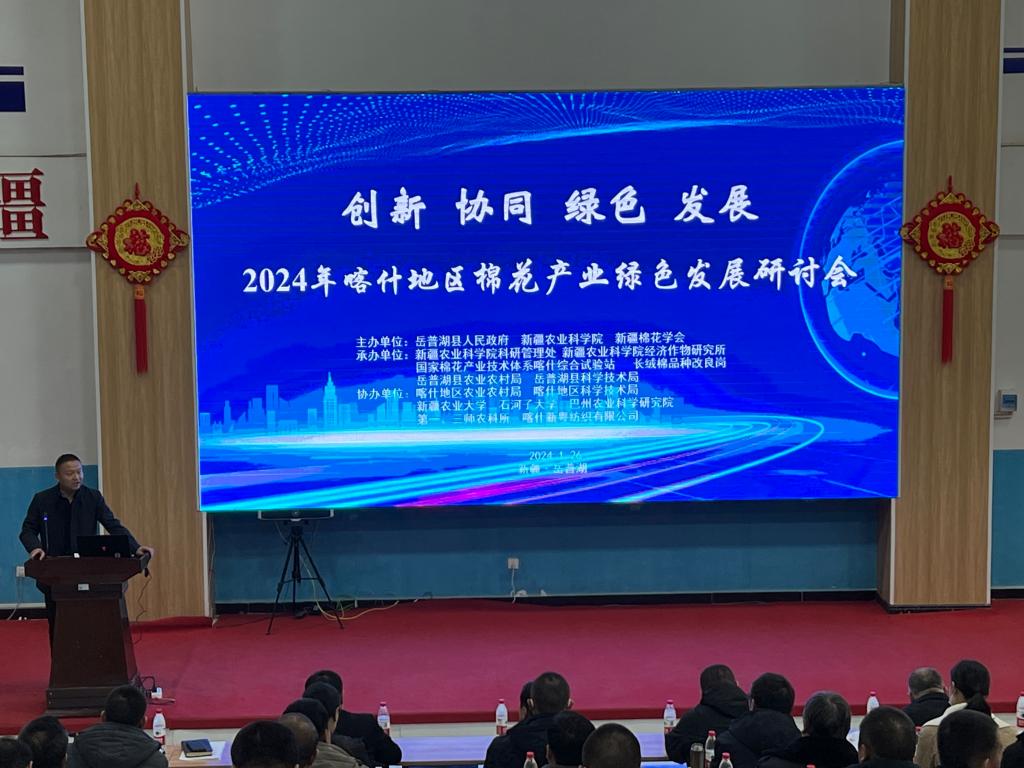 2024年1月25日-26日,由新疆農業科學院、岳普湖縣人民政府、新疆棉花學會主辦,新疆農業科學院經濟作物研究所、新疆農業科學院科研管理處、國家棉花產業技術體系喀什試驗站、岳普湖縣農業農村局、岳普湖縣科學技術局聯合承辦的2024年喀什地區棉花產業綠色發展研討會在岳普湖縣召開。來自山東省農業科學院、新疆農業大學、石河子大學等疆內外科研高校專家,國家和自治區棉花產業技術體系專家,喀什地區農村局等地區相關部門負責人、喀什地區12個縣市農業相關部門負責人,相關企業、合作社、種植大戶代表等共110余人參加會議。