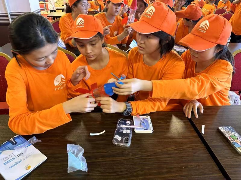 在科普館內,科普展覽也讓孩子們親身體驗科技帶來的魅力,講解員專門講解了水火箭的發(fā)射原理和基礎知識后,大家分組利用廢舊的可樂瓶,安裝增壓塞和側翼制作水火箭。