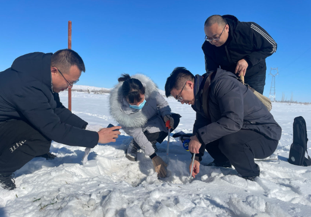 郭飛(右一)檢查冬麥越冬情況