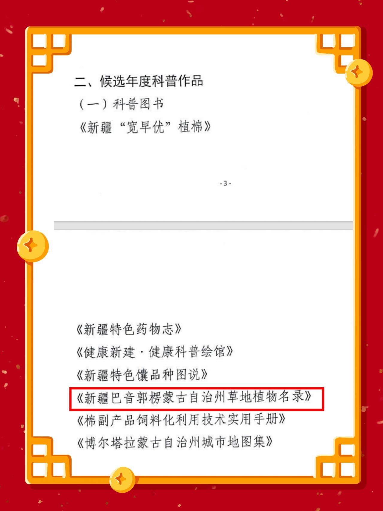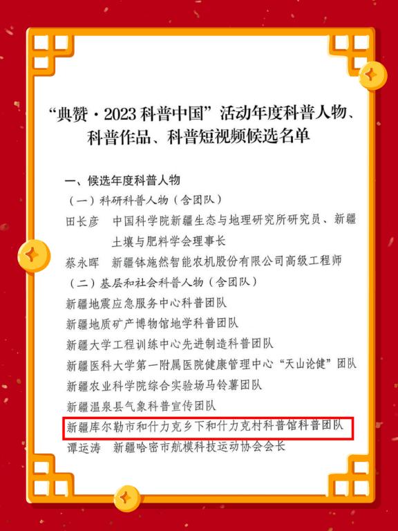巴州科協認真開展“典贊·2023科普中國”推薦工作,在新疆科協公示“典贊·2023科普中國”推薦活動年度科普人物(10人)、科普作品(10個)、科普短視頻(10個)候選名單中,巴州1人獲科普人物(團隊)推薦;1部科普圖書、1個科普展覽獲科普作品推薦;1個科普欄目獲科普短視頻推薦。