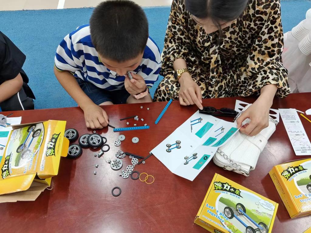 小朋友們一起來思考一下,什么是彈力呢?彈力有方向嗎?彈力產生的條件有哪些?生活中又有什么利用了彈力?主題活動三《“動手探奇”活動大禮包》通過手工組裝彈力小車讓孩子們體驗設計與動手相結合的新玩法,既開動腦筋,又培養他們的創造力和動手能力。活動開始,科技館老師和小朋友們熱情互動,擊掌鼓勵,讓大家迅速投入到課程學習中。小朋友們個個躍躍欲試。