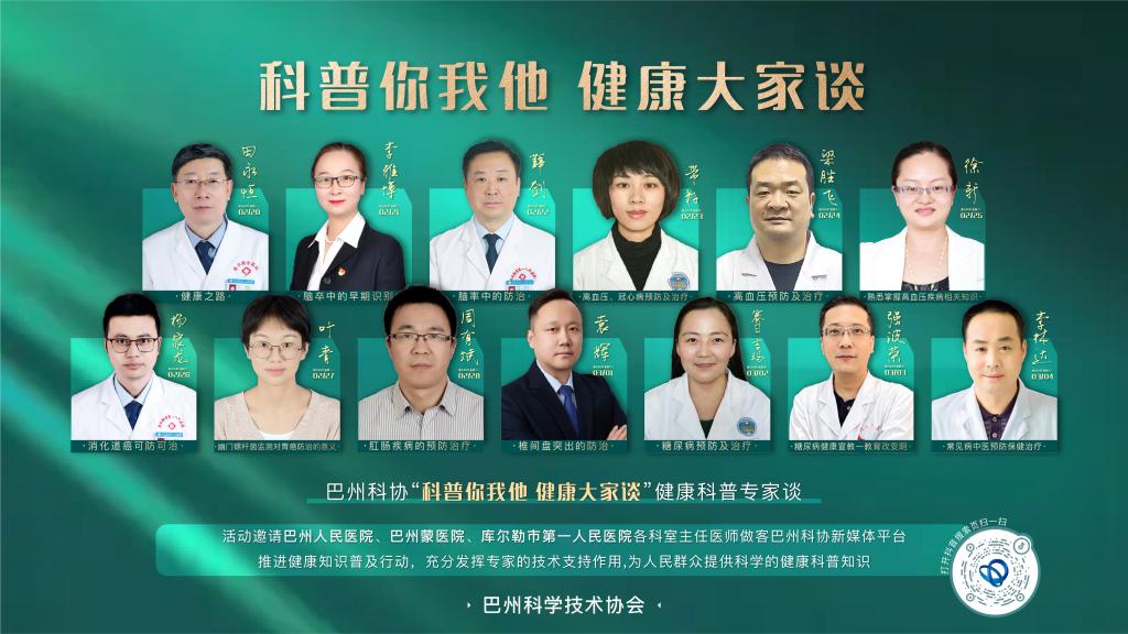 為進一步提升各族群眾的健康知識,巴州科協邀請了巴州第一人民醫院、巴州蒙醫院、庫爾勒市第一人民醫院具有豐富臨床經驗的13位主任醫師、專家,圍繞腦卒中、高血壓、糖尿病、腸道疾病、椎間盤等常見病開講,普及健康科普知識。