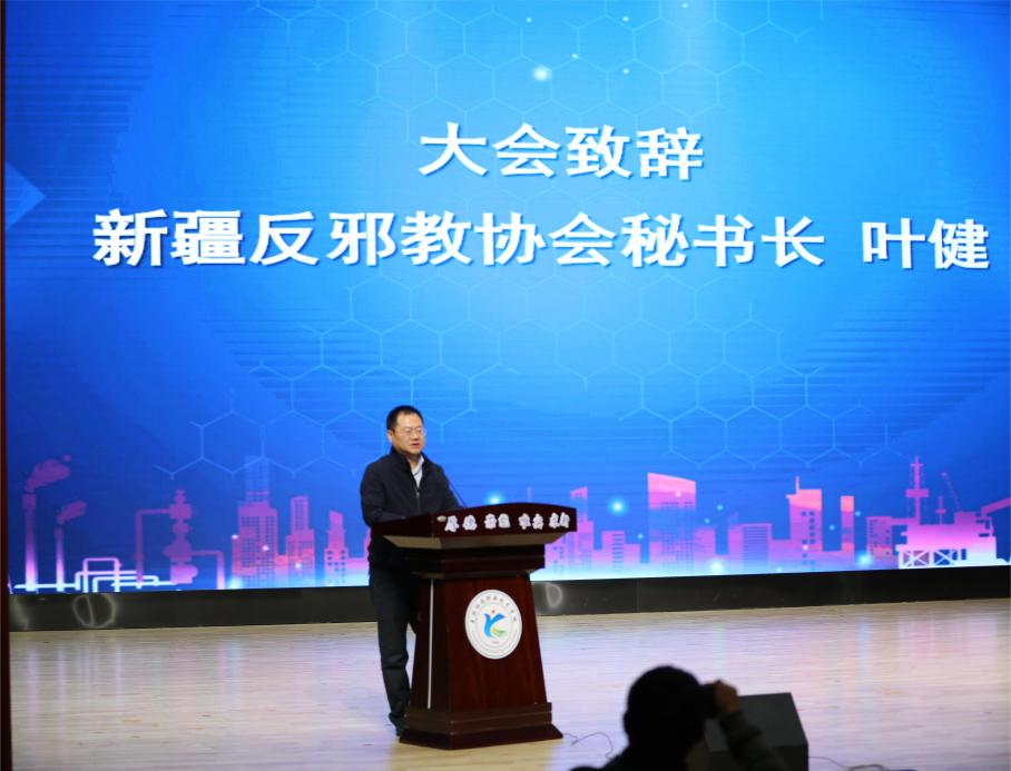 自治區科協、新疆反邪教協會秘書長葉健致辭。首先對大會的召開表示祝賀,他指出,要以這次換屆為契機,提振精氣神,凝聚戰斗力,努力開創科協工作新局面。一是認真學習領會習近平總書記重要講話精神;二是認真履行科協的工作職能;三是要切實加強科協自身建設。