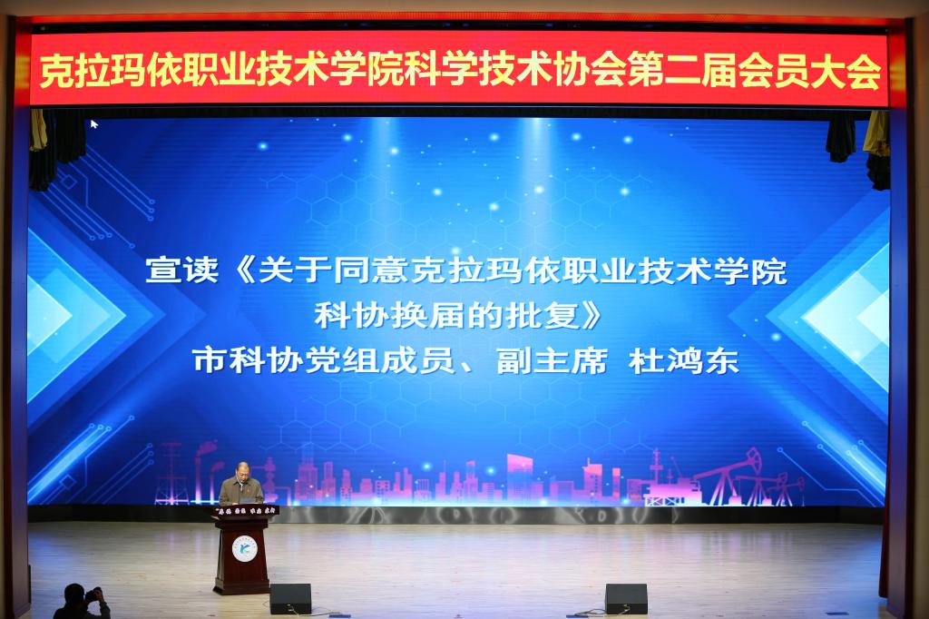 克拉瑪依市科協黨組成員、副主席杜鴻東杜鴻東宣讀《關于同意克拉瑪依職業技術學院科協換屆的批復》。