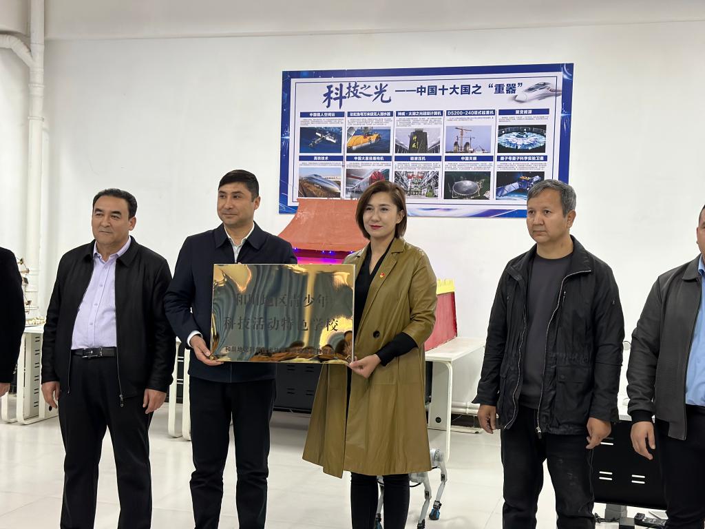 和田地區青少年科技教育活動中心主任海日古麗·艾爾肯參觀了學校科技活動室,對其內部設施建設、各類科技活動表示了肯定。墨玉縣第五中學在各類科技活動中表現突出、硬件設施完備、師資配備達標,符合地區青少年科技活動特色學校的評選要求,授予了“和田地區青少年科技活動特色學校”榮譽稱號,并舉行授牌、捐贈儀式,捐贈科普物資包括陸海空運動科技模型15個,“未來之星S”初級遙控平跑車6個、安全行車比賽賽道1套。