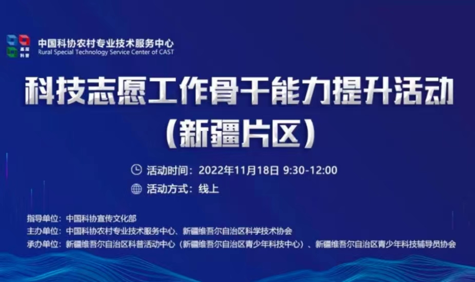 2022年11月18日,由中國科協農村專業技術服務中心、新疆維吾爾自治區科學技術協會科協主辦的科技志愿工作骨干能力提升活動(新疆片區)以線上觀看的方式舉辦。旨在進一步提高全區科技志愿服務效能,提升科技志愿者尤其是科技志愿工作骨干能力和水平。