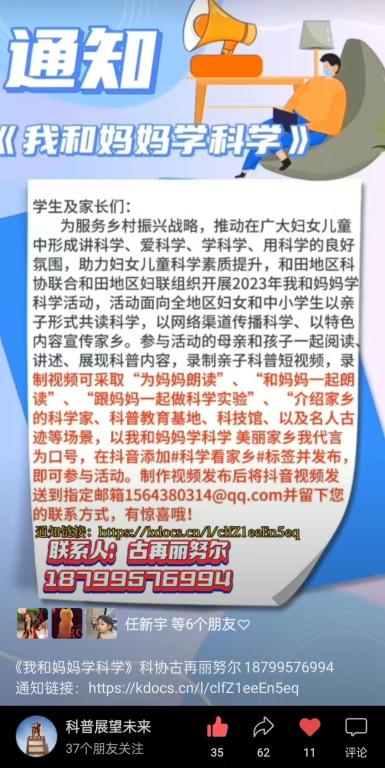 為落實和田地區科協《和田地區全民科學素質行動規劃綱要實施方案(2021-2035年)》的有關要求,提高我區農村婦女兒童科學素質,服務鄉村振興戰略,根據《中國科協科普部、全國婦聯宣傳部關于開展2023年“我和媽媽學科學”活動的通知》(科協普函基字〔2023〕25號)、《自治區科協、自治區婦聯關于開展2023年“我和媽媽學科學”活動的通知(新科協發〔2023〕69號)要求,和田地區科協、和田地區婦聯聯合發文,攜手動員各縣市科協、婦聯積極開展“我和媽媽學科學”活動,努力在廣大婦女和青少年中形成講科學、愛科學、學科學、用科學的良好氛圍,助力提升婦女、青少年科學素質。