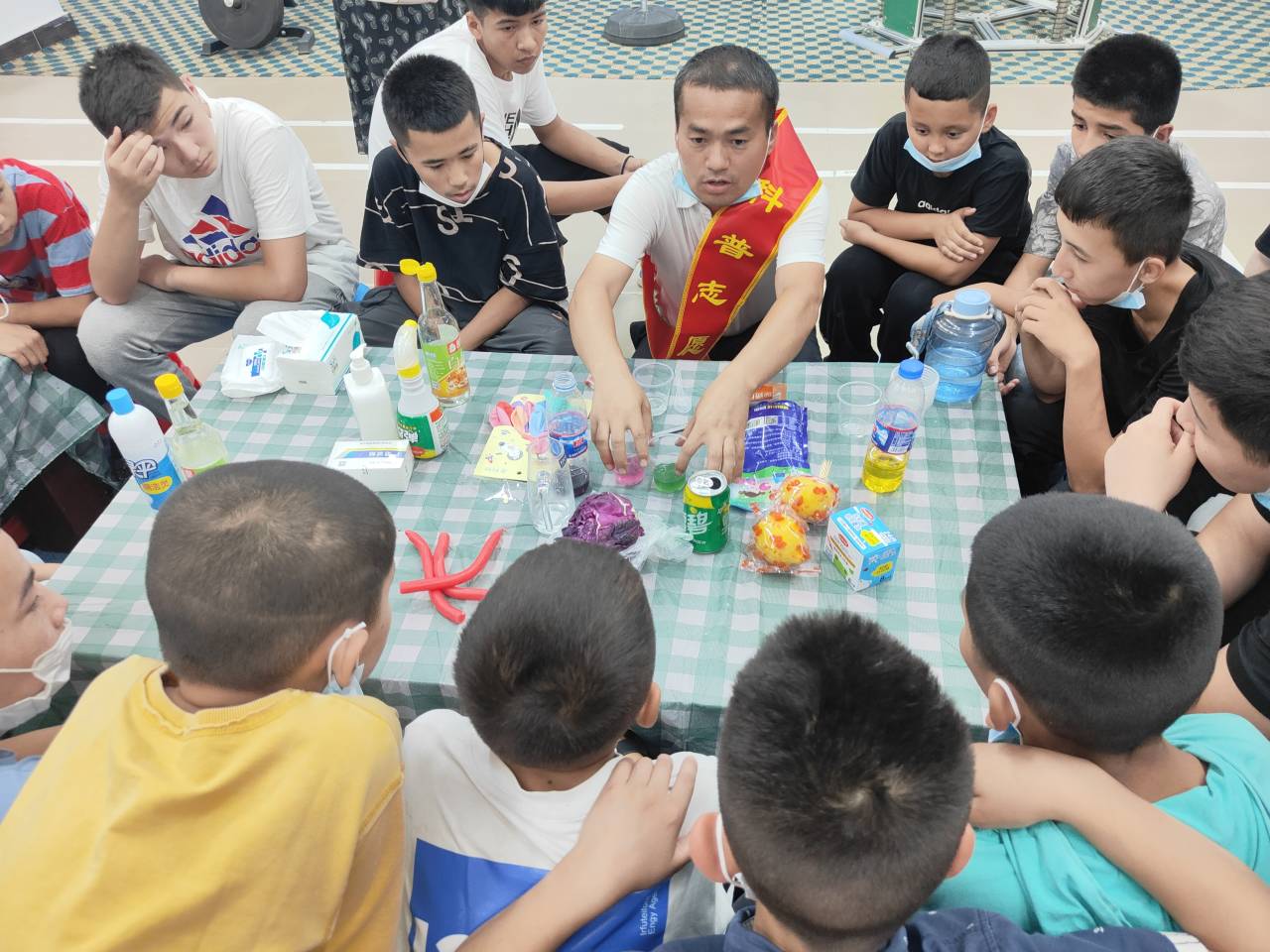 科普輔導(dǎo)員老師帶領(lǐng)大家做科學(xué)小實(shí)驗(yàn)