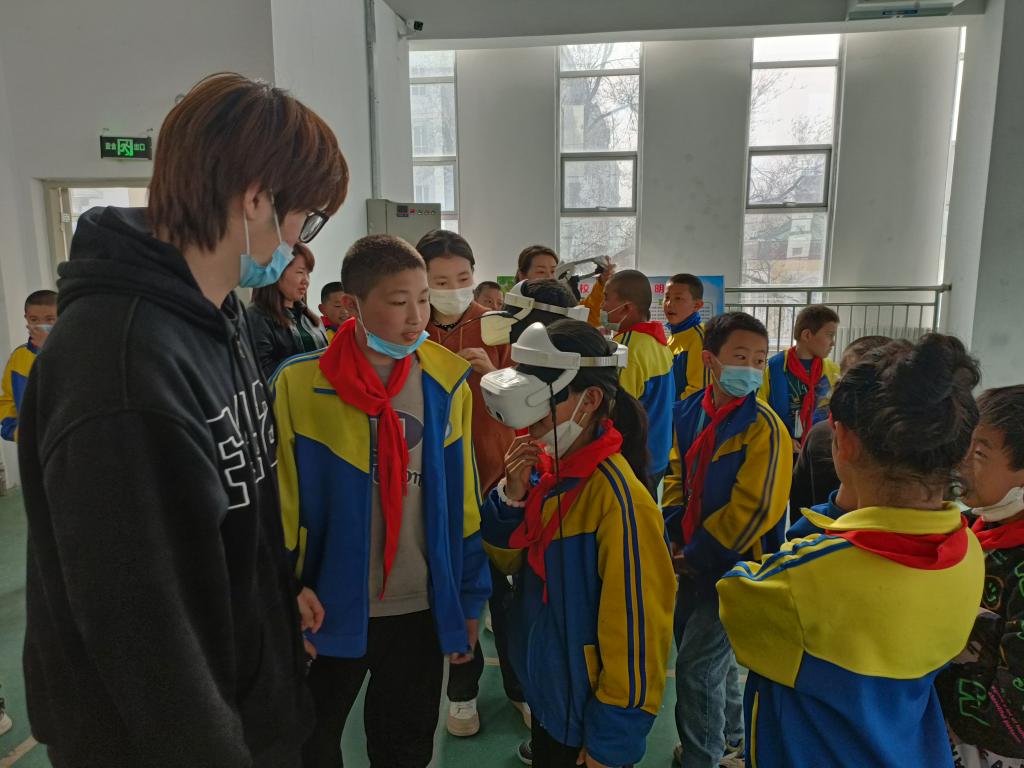 二樓創客空間教室,同學們被機器人集體舞表演牢牢吸引住了眼球,有的同學情不自禁地跟著機器人的動作舞動起來,還有VR眼鏡等實體觀看也讓同學們感受到科技的強大。