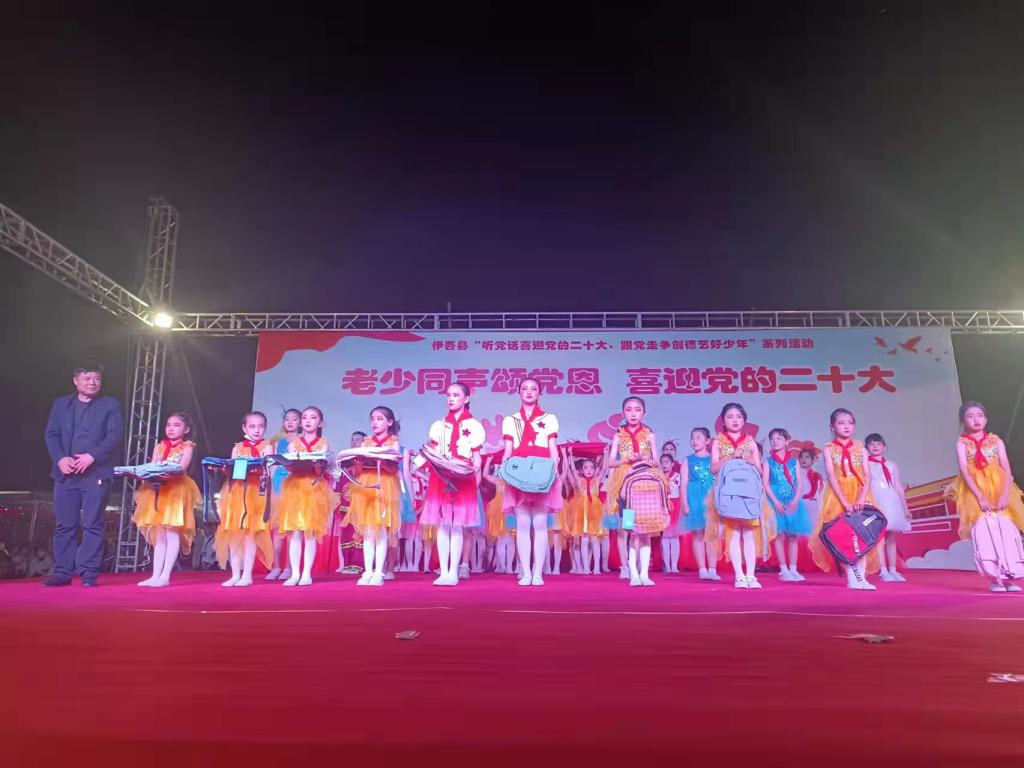 為喜迎黨的二十大勝利召開,近日,伊吾縣“老少同聲頌黨恩、喜迎黨的二十大”文藝匯演活動在縣新城區半園廣場圓滿落下帷幕。本次文藝匯演是伊吾縣“聽黨話喜迎黨的二十大、跟黨走爭創德藝好少年”系列活動之一,由伊吾縣關工委主辦,縣教育局、青少年校外活動中心承辦,縣文體廣旅局、融媒體中心、科協等單位協辦。